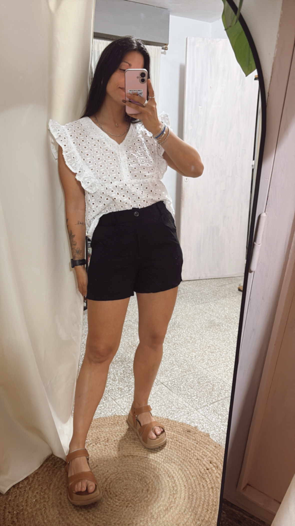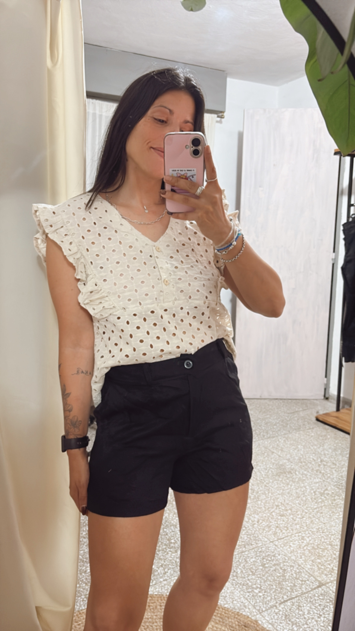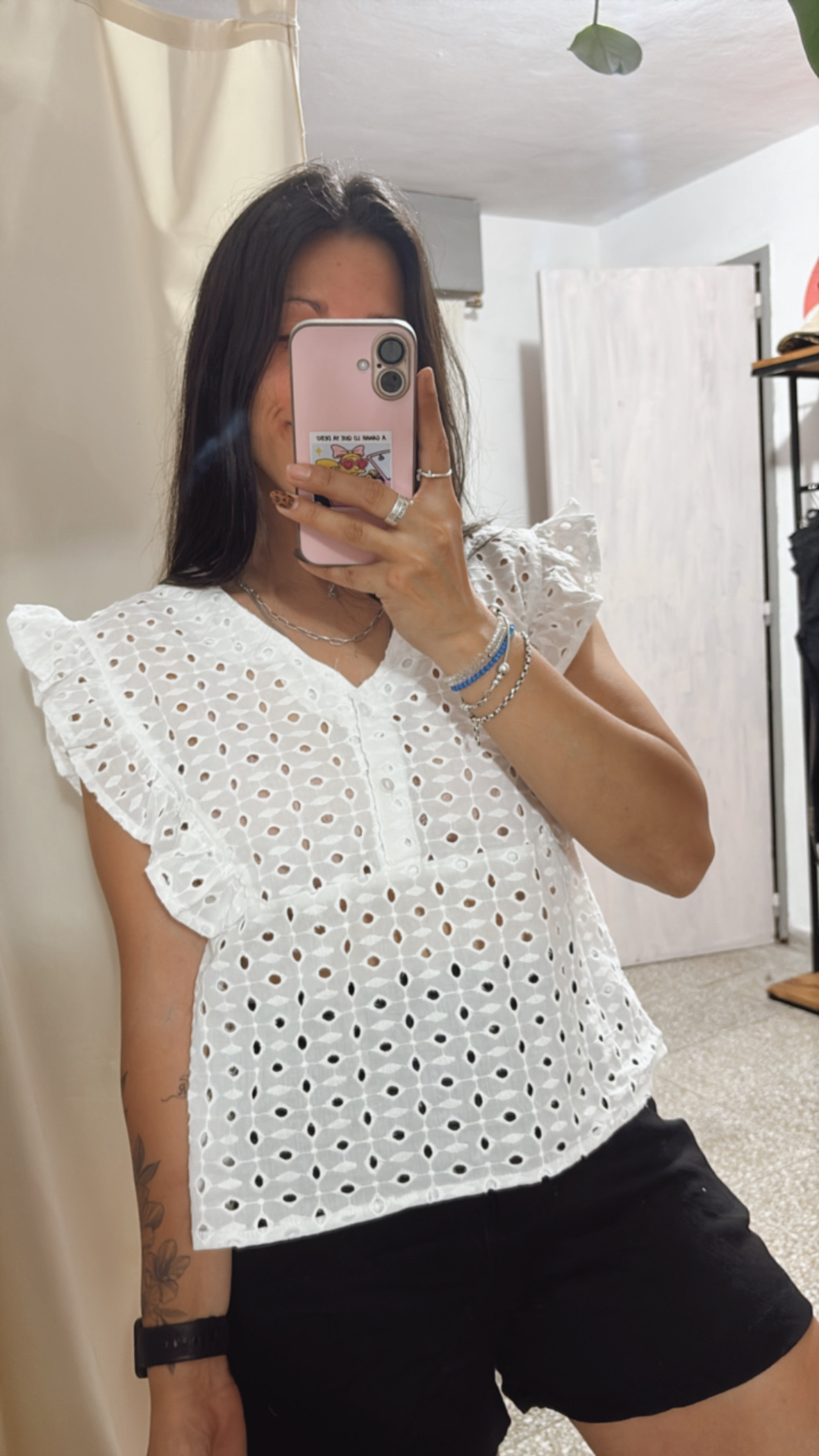Blusa Ana de broderie: súper femenina y fresca, con escote V, dos botoncitos frontales y voladitos delicados. Sin mangas y de corte sueltito para un calce cómodo y favorecedor. Talle único (S a L aprox.) Ideal para esta temporada.