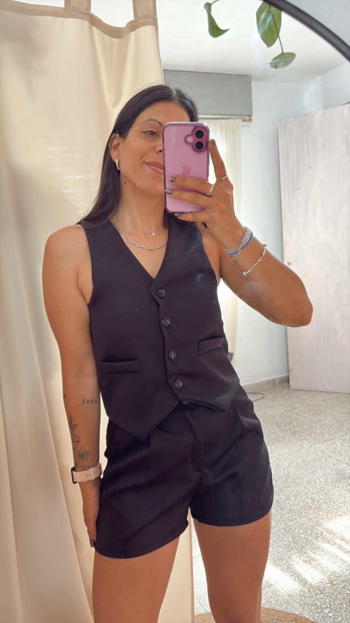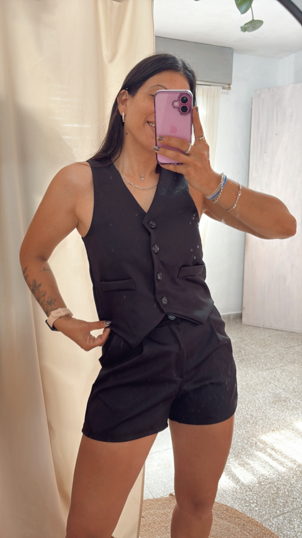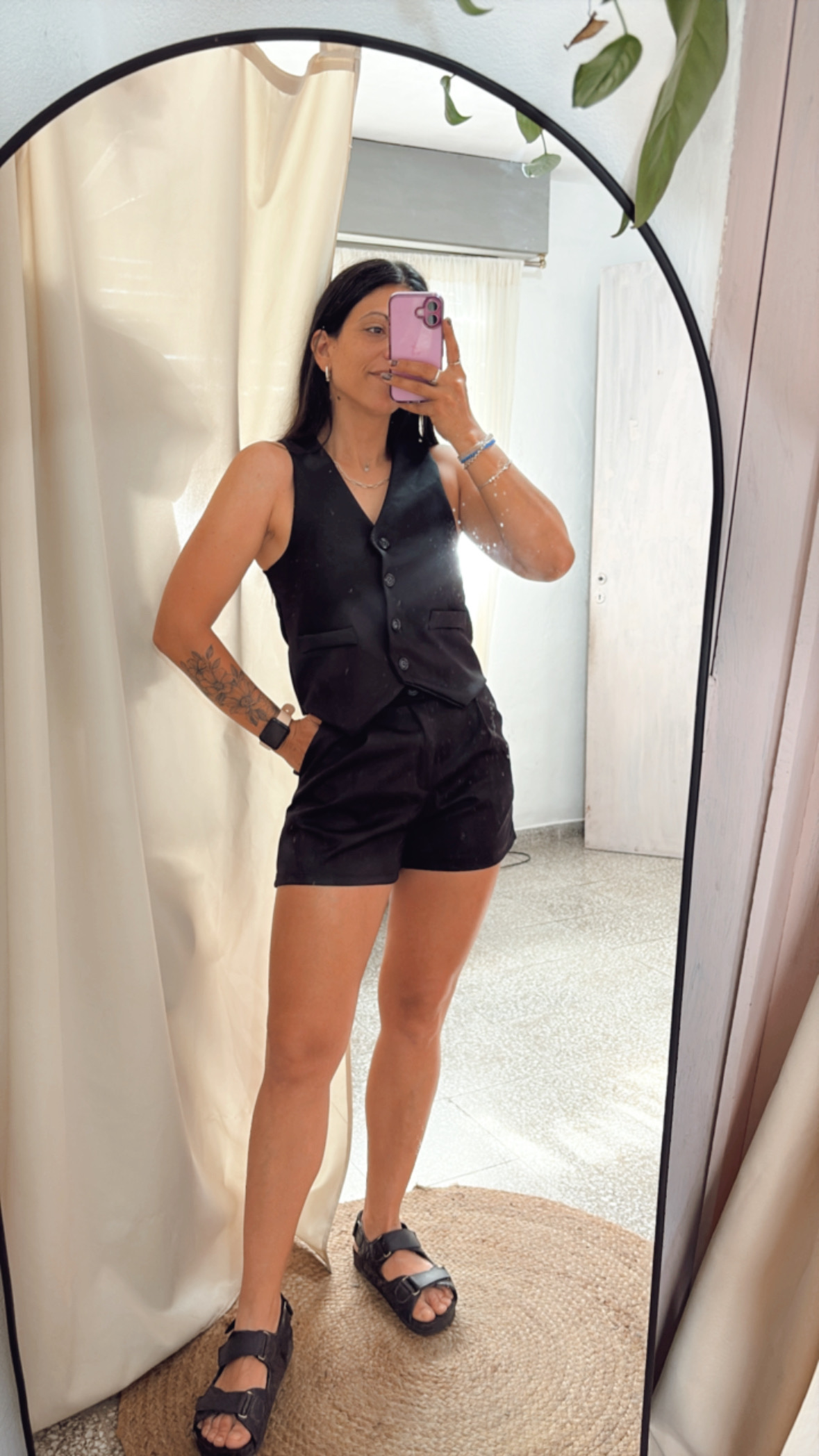 El Conjunto Minerva combina chaleco corto y short sastrero en color negro, ideal tanto para looks formales como para outfits más relajados. Disponible en talles S/M y M/L.