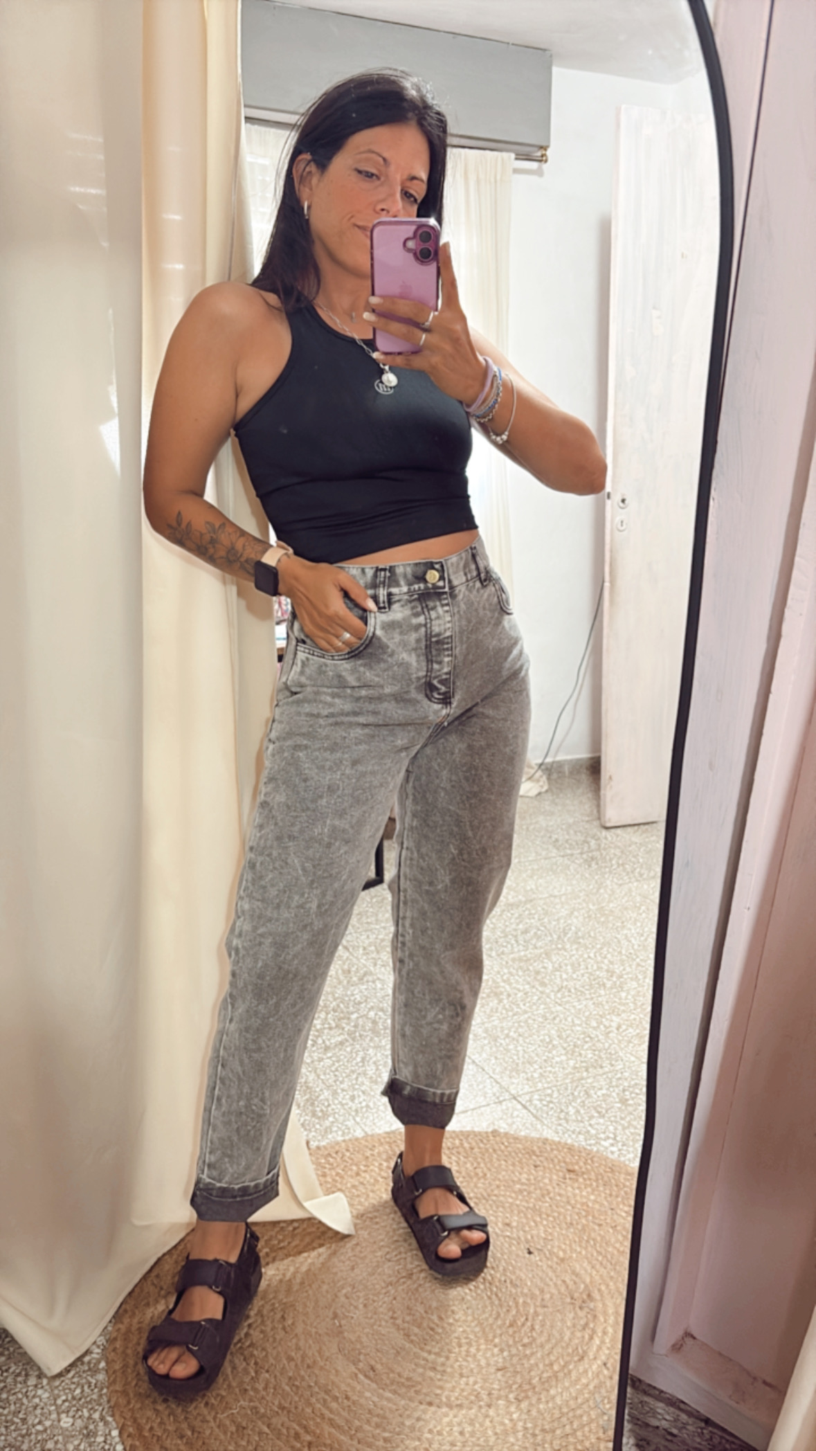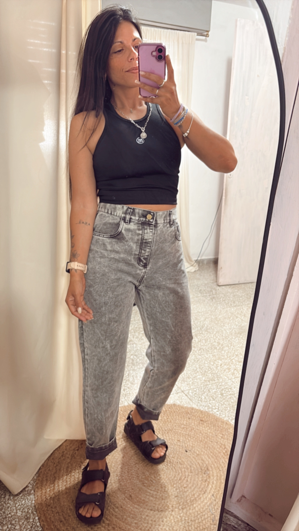 Jean mom fit de jean rígido en color gris, con calce cómodo en cadera y tiro medio/alto que estiliza la silueta.
