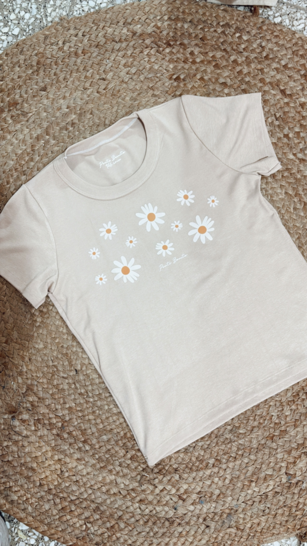 Remera de algodĂłn ribb color beige, escote redondo y calce entallado pero sĂşper elastizado. Intervenida por nosotras, con estampa de margaritas aplicada a mano que la hace Ăşnica, delicada y especial.