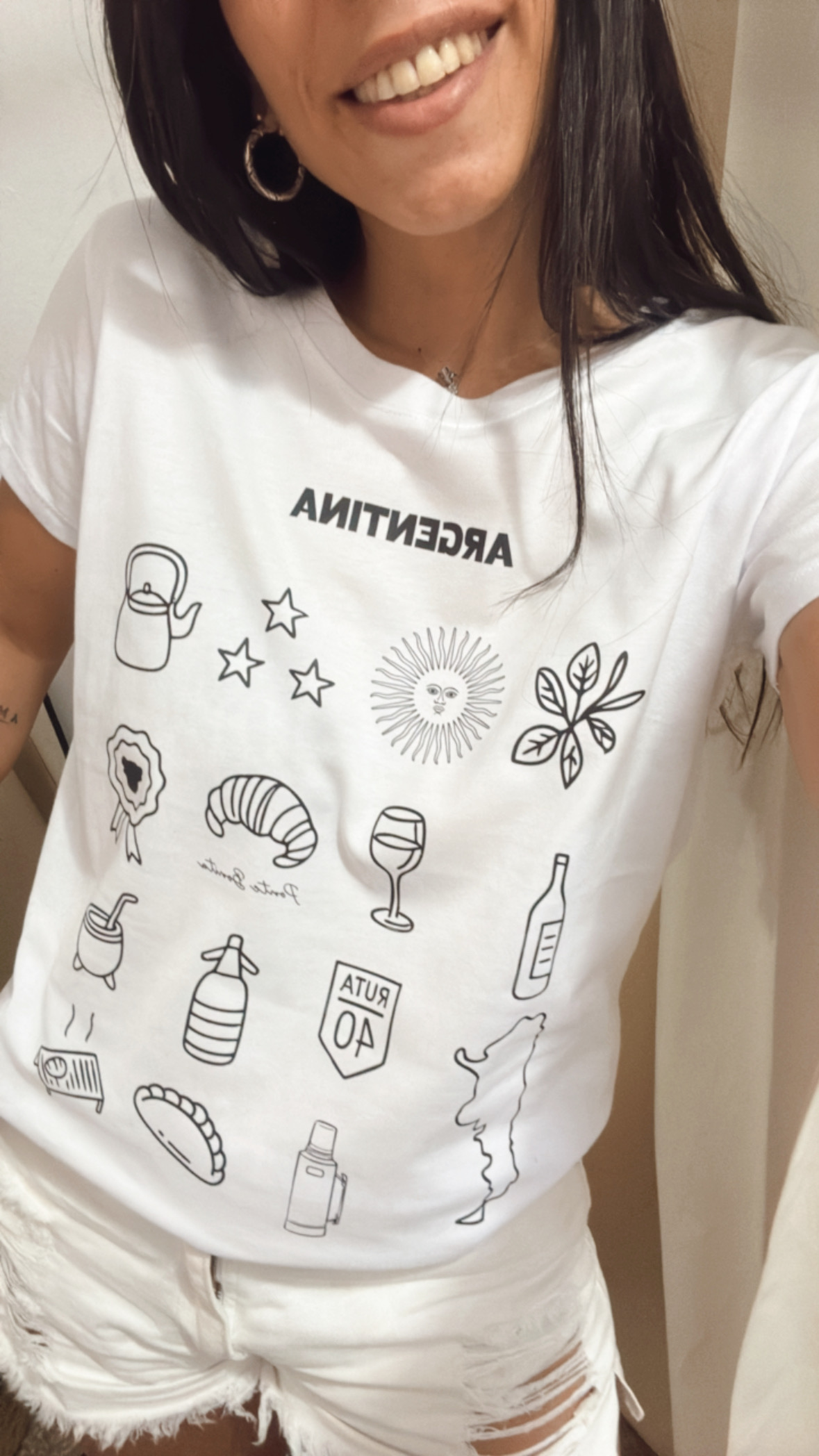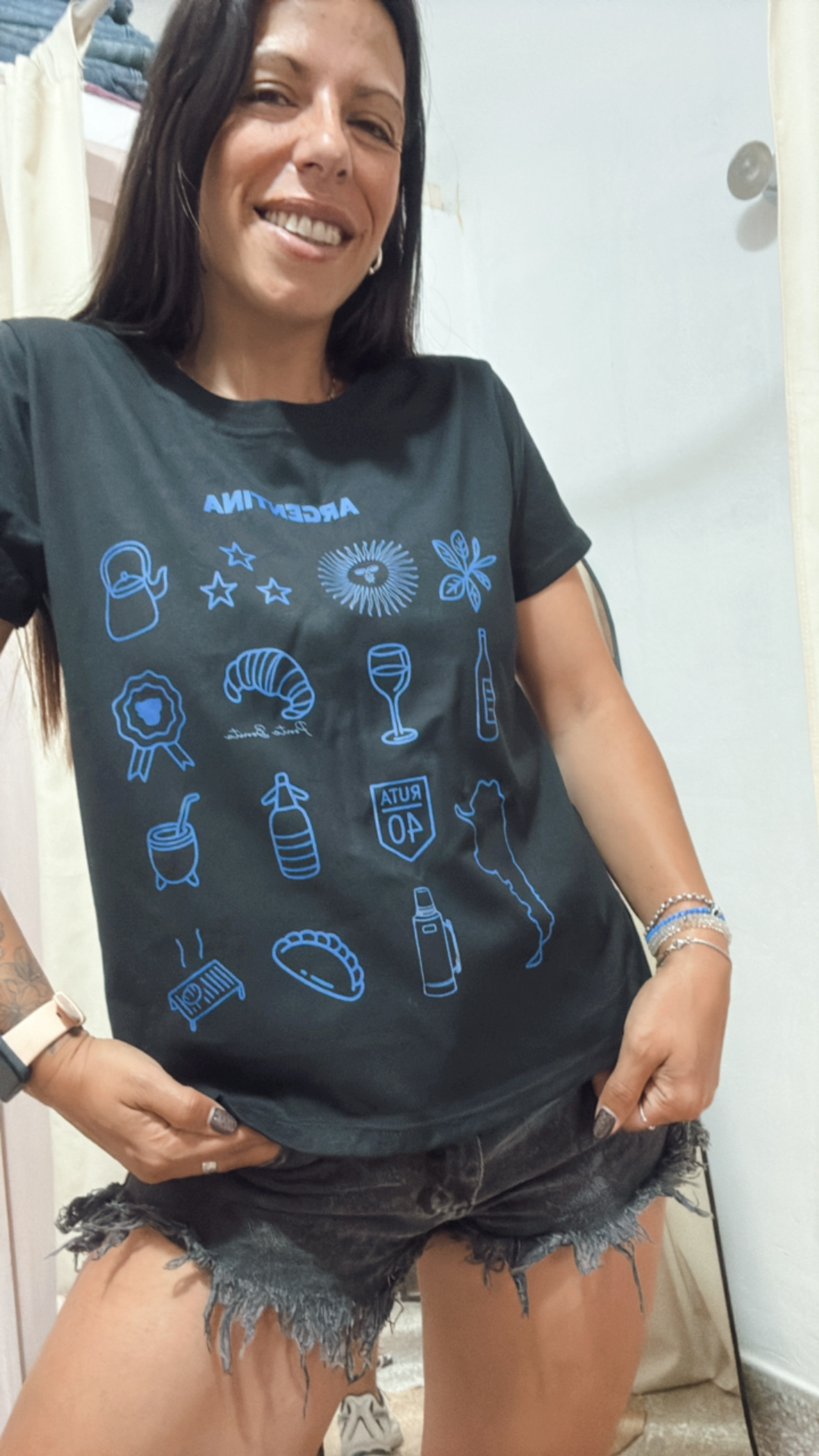 La Remera Argenta llega con ilustraciones de íconos bien argentinos: mate, empanada, asado, fútbol, estrellas y más. Un diseño único y lleno de identidad para lucir con orgullo.